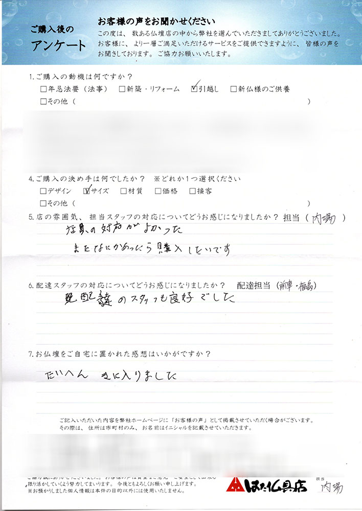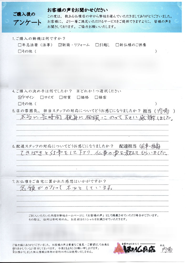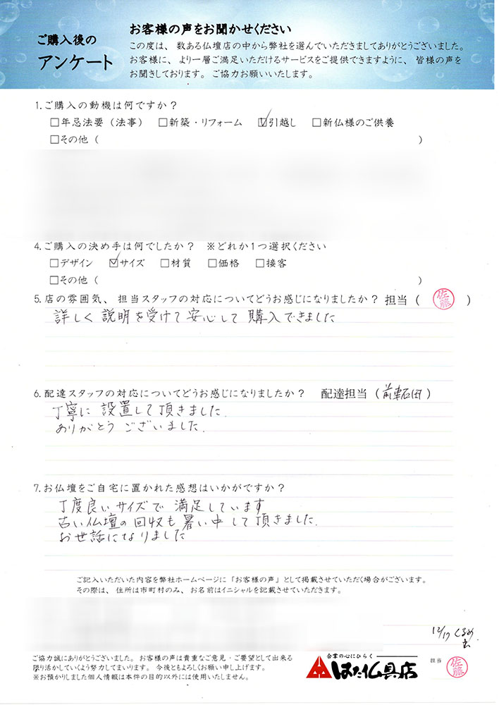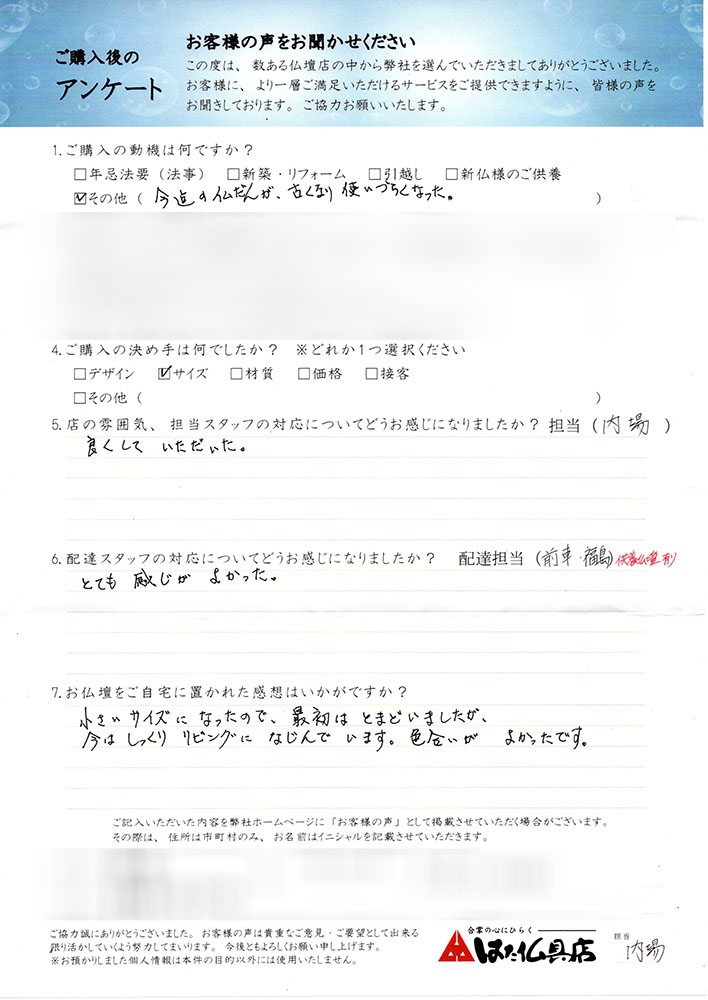 丁度良いサイズで満足しています。古い仏壇の回収も暑い中して頂きました。お世話になりました。