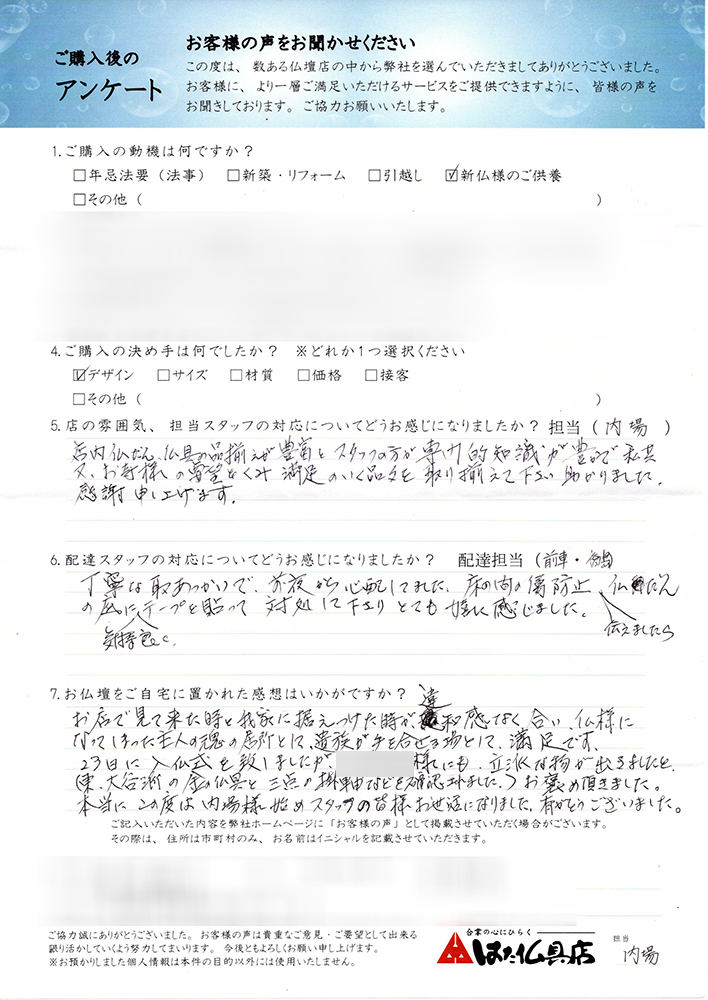お店で見て来た時と我が家に据えつけた時が、違和感なく合い、仏様になってしまった主人の魂の居所として、遺族が手を合わせる場として満足です。23日に入仏式を致しましたが、お寺様にも立派なものができましたと(東・大谷派の金の仏具と三点の掛軸などを確認されました。)お褒め頂きました。本当にこの度は内場様はじめスタッフの皆様お世話になりました。有がとうございました。