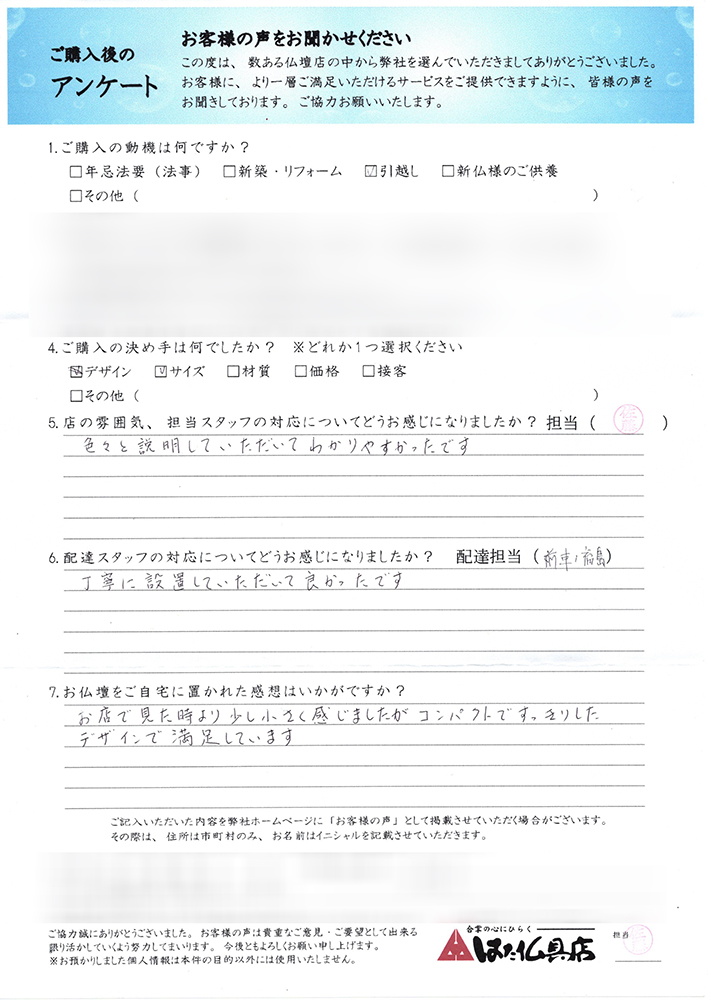 丁寧な取りあつかいで、前夜から心配してました床の間の傷防止伝えましたら、仏だんの底に気持ち良くテープを貼って対処して下さり、とても嬉しく感じました。