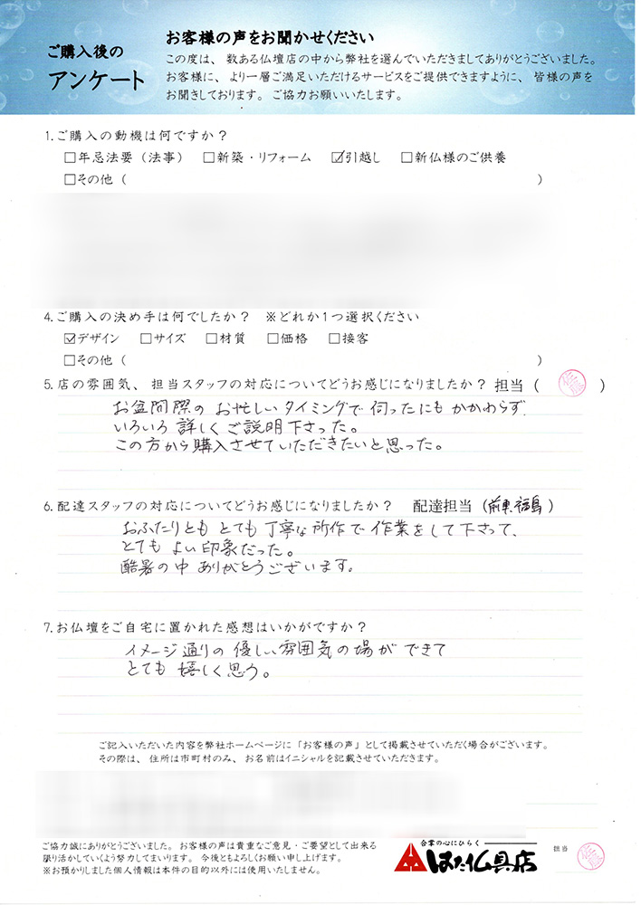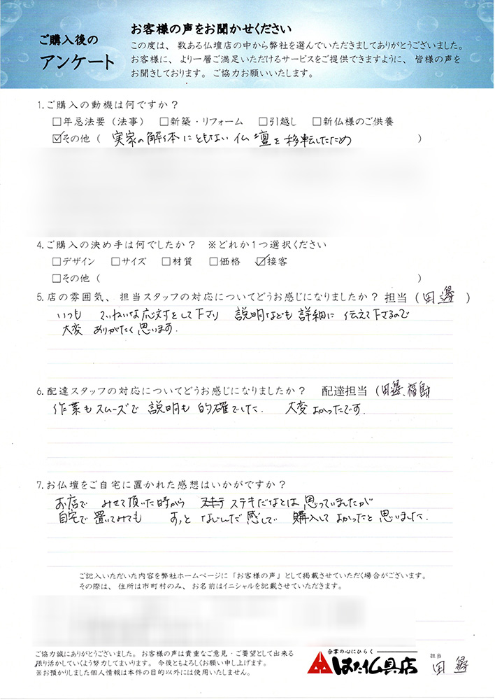 家にこられて仏壇の置き場所とか丁寧に取扱い頂き、説明も良くして教えて頂きました。