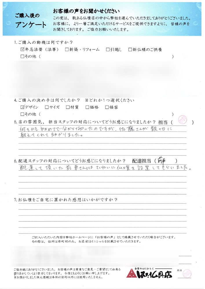 配達して頂いた前車さんには、ていねいに仏壇を設置してもらいました。