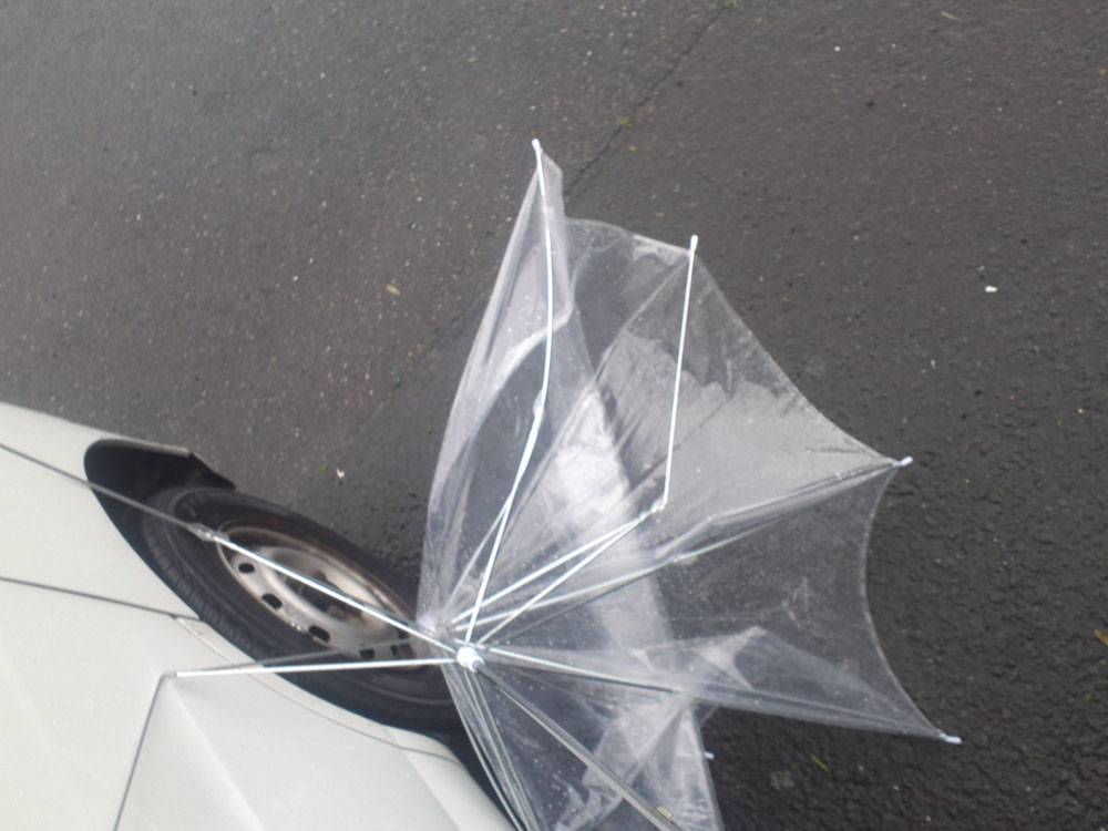 先日(5/11)、久しぶりに雨が降りましたが、風が強くて傘が写真のように。(苦笑)流石に使えないので、諦めて新しい物を購入しました。
