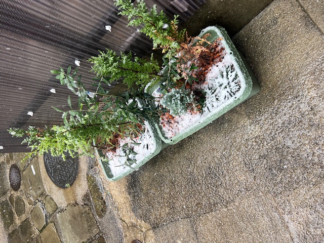雪にも負けず頑張っている大家さんご好意のプランターの中の植物です。(名前がわかりません)